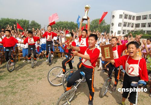 6月22日,辽宁省锦州市的某校园里举办首届奥林匹克日独轮车比赛。以纪念即将到来的国际奥林匹克日,表达对北京奥运的期盼与祝福。中新社发 李铁成 摄
