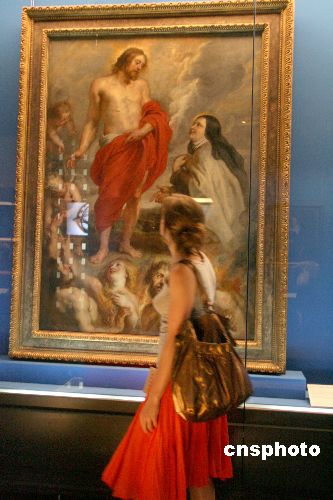 六月二十六日,“中国·比利时绘画500年”展在北京故宫博物院绘画馆(武英殿)举办开幕式,共展出174件艺术作品。本展览旨在使广大观众在艺术欣赏中具体感悟到东西方绘画在艺术观念、表现形式上的互融共通之处的各自不同的民族特色。图为一位观众观看17世纪鲁本斯的油画《阿维拉的圣泰瑞莎从炼狱中拯救门多萨》。中新社发 张勤 摄