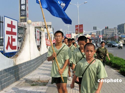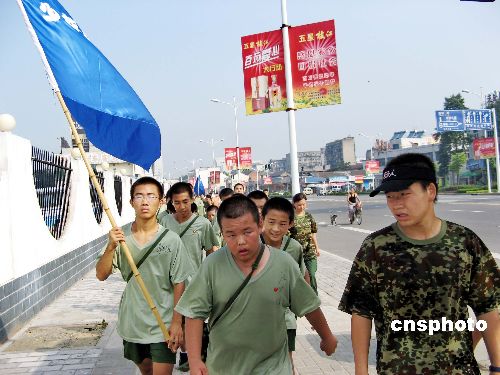 6月28日上午9时许,数十名男女学生在宜昌港路边急行。据悉,学生们早6点半从郊区动身,预计在烈日下急行90里路。据了解,这些学生是宜昌行走学校的学生,来自全国各地,当日在教练带领下参加强化训练。中新社发 大三峡 摄