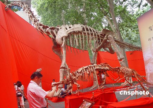 七月三日,河南新发现的白垩纪恐龙化石模型受到关注。当日,在郑州召开的河南白垩纪恐龙化石群发掘研究成果新闻发布会透露,中国最近在河南境内新发现汝阳黄河巨龙——洛阳中原龙动物群和栾川以小型兽脚类恐龙为主的动物群,其中发现十种以上恐龙,多数为新属种。中新社发 朱晓娟 摄