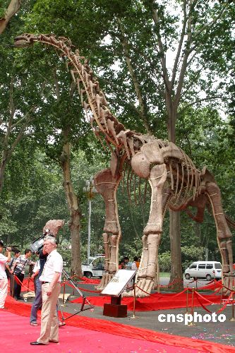 2007年7月3日,亚洲体腔最大恐龙化石在河南郑州与世人见面。据了解,该恐龙化石是由河南省国土资源厅结合国内外几十名知名恐龙专家在洛阳汝阳县刘店乡最近挖掘出土的。该恐龙被命名为汝阳黄河巨龙,长18米、肩部高度为6米,肩部宽3米,臀部高度为5.1米,臀部宽2.8米,单根肋骨长度可达2.93米,是目前已知亚洲最大、最重、体腔最大的恐龙。此化石历史可追溯至约1亿年至8500万年前。中新社发 王中举 摄