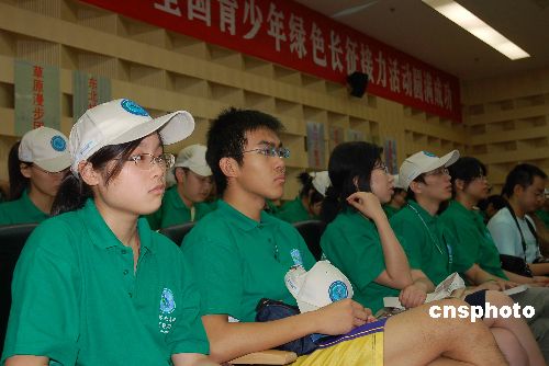 7月7日,“绿色长征 和谐先锋”——全国青少年绿色长征接力活动出征仪式在北京林业大学举行。上万名全国青少年生态环保志愿者组成的10支绿色长征队伍,分赴全国各地开展“促进生态文明建设,共创绿色奥运,共促社会和谐”环保活动。中新社发 潘旭临 摄