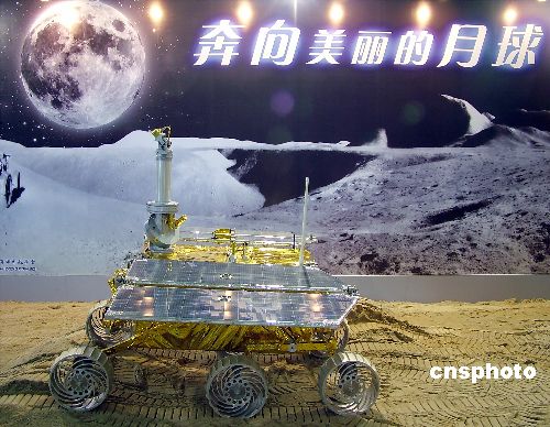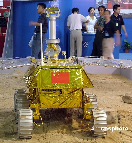 7月9日,脚踩6个轮子,站在“月球”表面,头顶CCD相机四周转动,巡视到的场景在电脑上即时传送……在上海航空展中,“月球巡视探测器”表现不凡。据了解,经过层层审批才得以在公众前亮相的月球车,将于2012年“嫦娥工程”实现“落地”计划后登陆月球。中新社发 绍常 摄