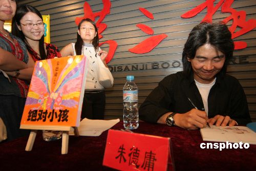 | 2007年7月14日,朱德庸在第三极书局签售《绝对小孩》。《绝对小孩》被誉为“朱德庸二十年最好玩的一本书”,是朱德庸首次选择儿童作为漫画主角的作品,他用一贯幽默诙谐的画风描绘出了“小孩眼中的世界,以及小孩世界和大人世界的拉拉扯扯”,展现了六个各具特性的“绝对小孩”,在这个并不绝对的世界里,每天上演着他们自己的“绝对生活”,绝对的喜怒哀乐和绝对的小小梦想。中新社发 吴芒子 摄