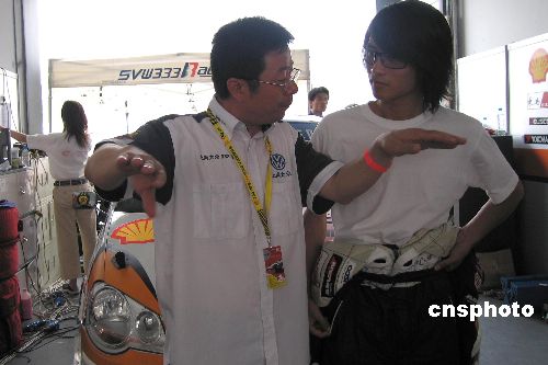 7月22日,2007华赛CFR全国汽车场地锦标赛第二站赛在北京金港赛车场举行。图为上海大众333车队经理夏青在对韩寒进行细心的指导。中新社发 李岩 摄