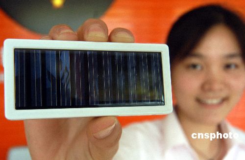7月24日,一位工作人员在展示新上市的太阳能手机充电器。日前,安徽亳州市一家高科技公司生产出一种太阳能充电器,这款太阳能手机充电器配备了多种型号的插孔,不同品牌的手机都可以使用。同时,这种太阳能手机充电器除了能给手机充电外,还可以给MP3、MP4、数码相机等多种移动数码产品充电,使用起来非常方便。中新社发 张延林 摄