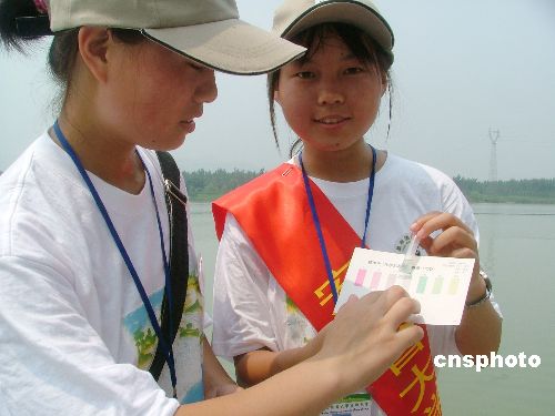 7月25日,大学生环保志愿者在检测巢湖水质。当日,安徽省大学生绿色营暨骑单车环巢湖湿地使者行动在巢湖学院启动,来自上海、重庆、四川、福建、安徽等全国10个省(市)15所大学的25名大学生环保志愿者参加了环巢湖湿地使者系列活动。中新社发 苏东山 摄