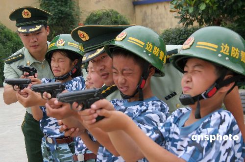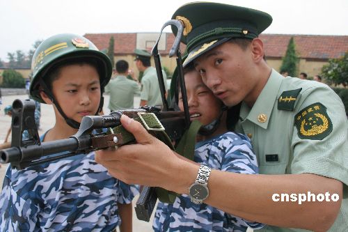 7月30日,江苏连云港赣榆边防大队的暑期“代理家长”将各自帮助的“留守儿童”接到军营,开展体验“军营一日”活动,向孩子们介绍武器使用、队列训练、军事知识,并向他们赠送学习用品,让他们度过有意义而又快乐的一天。中新社发 穆道勇 摄
