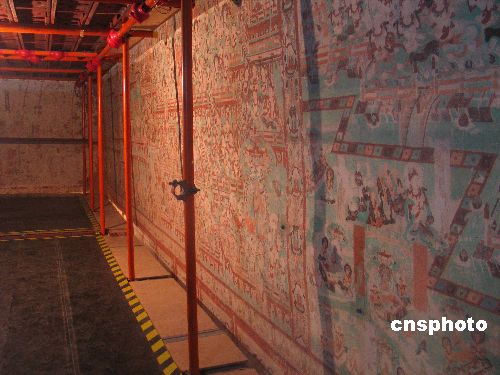 世界遗产中国敦煌莫高窟现存有壁画的洞窟存在着不同程度的病害,其中第八十五窟具有代表性,从一九八九年开始,敦煌研究院与美国盖蒂保护所展开合作,对其进行保护修复。历经十多年的修复、跟踪,目前其修复工作已接近尾声,今年将全部结束。八月三日,敦煌研究院文物保护技术服务中心主任汪万福表示,项目结束后,他们将继续对窟内环境进行检测,并对保护措施进行跟踪监测。中新社发 殷春永 摄