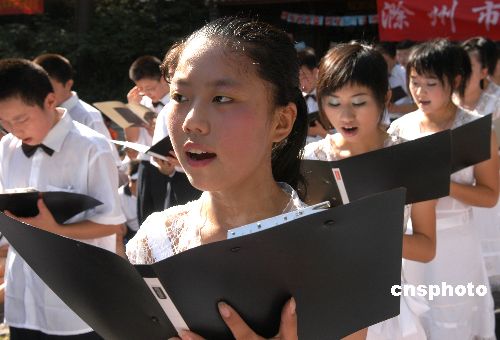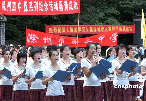 8月9日上午,安徽滁州市八所中学千名中学生来到琅琊山风景名胜区,在醉翁亭畔展开《醉翁亭记》集体诵读大赛,以此纪念欧阳修诞辰1000周年。著名播音员方明应邀来到现场和同学们见面,并即兴进行了古文朗诵和签名活动。公元1045年至1048年间,宋代著名文学家、历史学家、政治家欧阳修在滁州任知州期间,写下了千古流芳的散文名篇《醉翁亭记》。中新社发 王家国 摄
