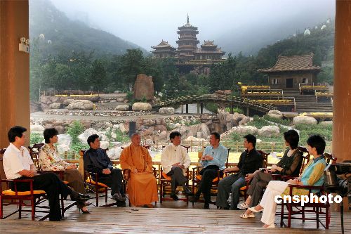 八月十日晚,《禅宗少林·音乐大典》艺术总监、音乐原创谭盾,禅学顾问易中天,文化顾问、少林寺方丈释永信,制作人、编剧、导演梅帅元、舞蹈设计黄豆豆等人齐聚嵩山待仙沟,一同论“禅”。中新社发 慎重 摄