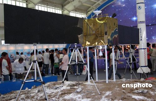 9月4日,在沈阳开幕的第六届中国国际装备制造业博览会暨航空航天配套零部件展览会上,即将探月的中国第一颗绕月探测卫星“嫦娥一号”首次展出。此次展出的“嫦娥一号”飞船、登月车、搭载物等虽是模型,也还是引起了人们的关注。中新社发 沈殿成 摄