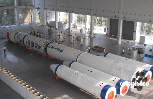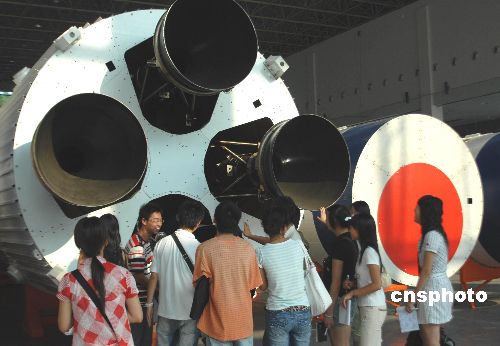 9月5日,中国航天搭载物品武汉巡展布展工作在武汉科技会展中心进行。本次巡展将于9月9日开幕,并正式对武汉市民开放。已经整体对接安装完毕的长征二号运载火箭(CZ-2E)是本次巡展最大亮点。展品还有各种型号的捆绑运载火箭(1:10比例)模型、火箭整流罩残骸、火箭发动机残骸、卫星回收舱、降落伞等各种部件实物。中新社发 楚天行 摄