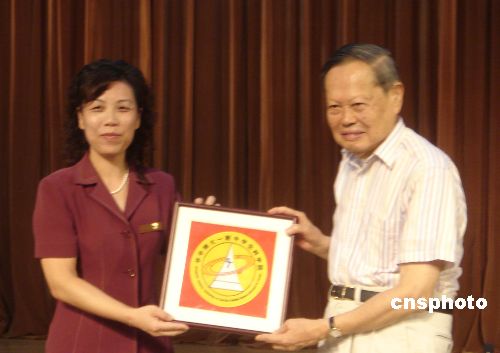 著名科学家、诺贝尔奖获得者杨振宁先生,九月七日走进武汉的华中师范大学第一附属中学,向该校一千多名师生做精彩演讲,勉励学子们树立正确的人生观。演讲结束后,师生们向杨振宁赠送该校科学院院徽。中新社发 徐金波 摄