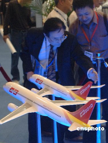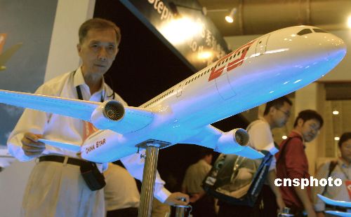 9月19日,由中国民用航空总局,中国航空工业第一集团公司主办的“第十二届北京国际航空展览会”在中国国际展览中心开幕。此次展会除了众多国际著名航空制造公司参展外,中国民营企业成为展会的明星。成立刚有一年、注册资本1000万元的中国民营企业--“广东昌盛飞机设计有限公司”,展示完成设计的三款双通道大型越洋飞机、三款单通道干线飞机模型。中新社发 邹宪 摄