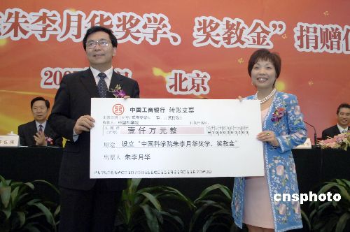 9月29日,“中国科学院朱李月华奖学、奖教金”捐赠仪式在北京人民大会堂举行。全国人大常委会副委员长、中科院院长路甬祥、国务院港澳办常务副主任陈佐洱、中联办副主任黎桂康等出席仪式。中新社发 徐曦弋 摄