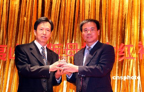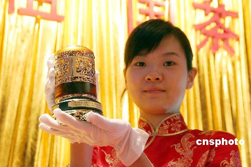十月十日,北京紫禁城外端门大殿内,最后一次采摘自福建武夷山三百五十年母树大红袍茶叶二十克,由中国国家博物馆珍藏。武夷山二00六年五月起停采留养母树大红袍,作为该馆收藏的首份现代茶叶是二00五年五月三日采摘自大红袍母树,按照列入首批国家非物质文化遗产名录的武夷岩茶(大红袍)制作技艺制作而成。中新社发 周文杰 摄