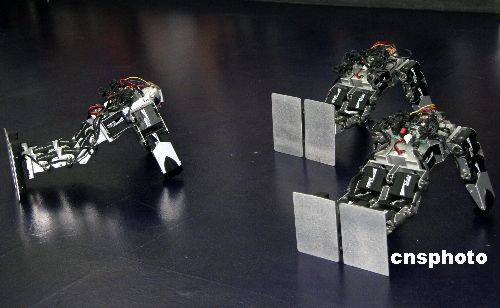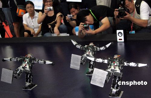 10月12日,几个仿人机器人伴着“洗唰唰”的音乐,在深圳高交会的展示台上翩翩起舞,吸引着众多观众和媒体的目光。这款机器人由哈尔滨工业大学计算机学院研制。中新社发 孙自法 摄