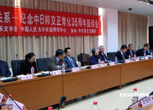 10月18日,“廖承志与中日关系——纪念中日邦交正常化35周年座谈会”在北京中国人民大学举行。该座谈会由中国中日关系学会、中国人民大学东亚研究中心共同举办,与会的有中日友好协会副会长王效贤、日本驻华大使馆公使道上尚史、以及几十位专家学者、相关人士。大家在缅怀廖承志先生的同时,对中日关系的发展纷纷发表了自己的见解,气氛凝重而又不失建设性。据悉,这次座谈会的举行源自新近由中共党史出版社出版的一本新书,书名为《廖承志与日本》。作者是原新华社驻东京首席记者吴学文先生和时事出版社编审王俊彦先生。中新社发 单琪 摄