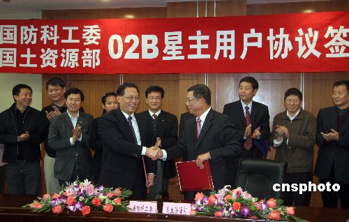 十月二十九日下午,中国国防科学技术工业委员会与国土资源部签署协议,后者正式成为中巴地球资源卫星○二B星主用户,双方将以此为契机,携手推动并充分发挥中巴地球资源卫星○二B星的应用效益。国防科工委副主任兼国家航天局局长孙来燕(左)、国土资源部副部长李元代表双方签署《国防科工委、国土资源部关于中巴地球资源卫星○二B星主用户机制试点的协议》。中新社发 孙自法 摄