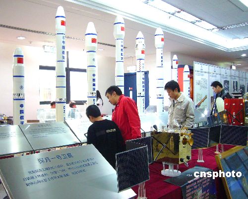 10月29日,在北京西单图书大厦,中国航空航天知识普及展上的实物模型及与之相关的科普书籍让观者大饱了眼福。随着“嫦娥一号”的发射成功,京城掀起了一股普及和了解祖国航空航天发展成就的热潮。中新社发 玉龙 摄