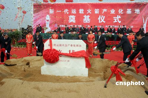十月三十日,中国国防科学技术工业委员会、天津市政府官员同中国航天科技集团公司及该公司所属中国运载火箭技术研究院负责人等,在天津滨海新区为中国新一代运载火箭产业化基地挥锹奠基。中国新一代运载火箭产业化基地项目,是新一代运载火箭研制工程的基础保证,也是后续批量生产和产业化、军民结合的航天高科技重要基地。该项目总投资约数十亿元人民币,总占地面积约三千亩,分为一期工程和二期工程。建成后将满足中国未来三十至五十年发展空间技术及和平利用空间的需要,实现运载技术跨越式发展和航天可持续发展,对引领中国高科技产业发展有着重大的辐射和推动作用。中新社发 孙自法 摄