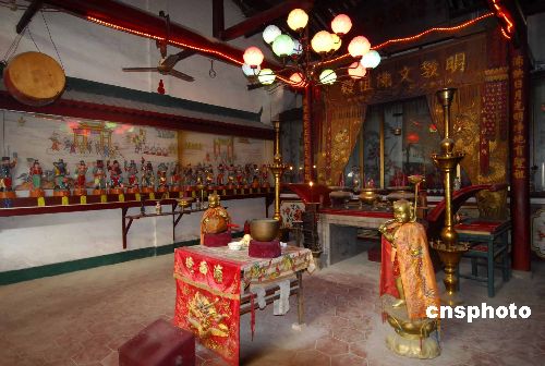 日前,经有关专家学者考证,福州市台江区宁化街道浦西路上的“福寿宫”曾是“明教文佛祖殿”,庙里保存着一尊清代脱胎工艺制造的明教文佛像,以及清代绘制的明教文佛祖殿全景图挂轴,福州市文物局原局长曾意丹表示,所有这些实物都已证明这座庙宇是福建省乃至全国罕见的又一明教(摩尼教)重要遗址。图为“福寿宫”正殿中间写有“明教文佛祖殿”字样。中新社发 王东明 摄