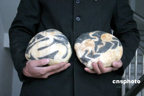 十一月十九日,河南伊川一奇石爱好者展示其收藏的两块有“龙”、“鹤”图案的奇特石头。据介绍,这位奇石爱好者最近在伊河滩捡到两块奇特的石头,两块石头均呈青灰色,大小相近,高约三十厘米、宽约二十厘米、厚约五厘米。一块正面图形酷似蛟龙,背面像北京奥运会舞动的“京”字会徽;另一块正面图案如同两只嬉戏的仙鹤,背面则显现出一副抽象的山水图。两块奇石上的图案惟妙惟肖、形象逼真。经地质专家徐海龙鉴定,确认这两块奇石是天然的。中新社发 朱晓娟 摄