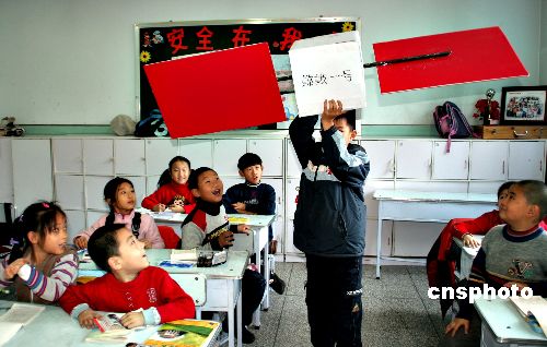 11月27日,哈尔滨市江沿小学艺术班的同学在展示他们制做“嫦娥一号”的模型。中新社发 姚庭山 摄