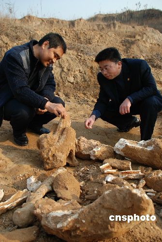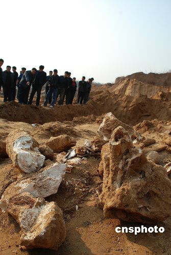 12月5日,山东淄博周村区王村镇西道村砖厂挖掘出疑似“恐龙”的巨型动物骨骼化石。当日10点48分,正在淄博周村区王村镇西道村砖厂施工的司机小郝,给村主任刘道新打电话说“挖掘机在工作时挖到了大量的化石,很像是动物的骨骼。”在现场进行保护的彭阳派出所的所长于成杰介绍说,这次挖到的化石很大,露出来的化石有6米多长,呈圆柱状细端的直径有18-19厘米,粗端的直径有30-40厘米。其动物骨格的特征非常明显,其体积显然比大象要大的多,与史前动物“恐龙”骨骼化石极其相似。中新社发 梁宝海 摄