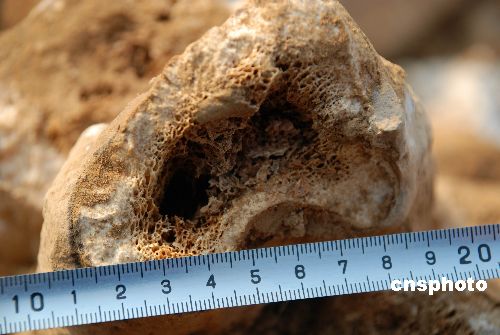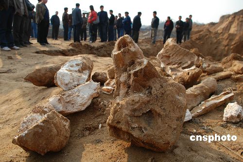 2007年12月5日,山东淄博周村区王村镇西道村砖厂挖出的疑似恐龙化石,通过山东省博物馆对部分化石鉴定,初步认定其为生活在更新世晚期的古菱齿象。山东省博物馆从挖掘的臼齿化石上认定是古菱齿象,是生活在距今1万—20万年的晚期更新世的大型哺乳动物。这些新发现的古菱齿象臼齿石化程度并不完全,说明这种大型哺乳动物几万年前生活在这片土地上时,淄博当时的气候温暖、湿润。中新社发 梁宝海 摄