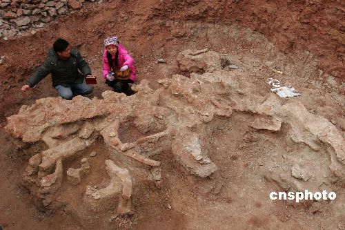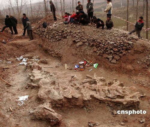 2007年12月中旬,地质勘测人员在河南汝阳县刘店乡洪岭开始发掘一化石岩层,目前发掘出地面的脊背以及7节颈椎长6米,且衔接为一具比较完整的恐龙化石形态,剩余的头部、尾部和腿部化石仍在发掘中。中新社发 张晓理 摄