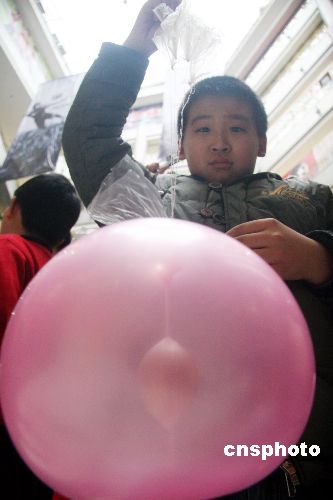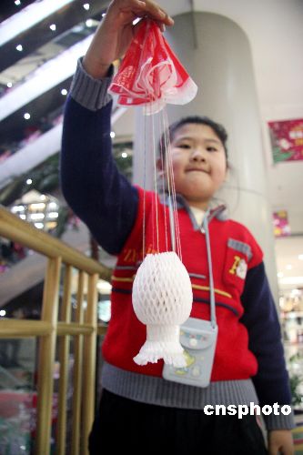 12月24日,来自沈阳市12所小学的100多名小学生在太原街的东顺百货商店的共享大厅内玩起了领人瞩目的“鸡蛋撞地球”的大赛。这次比赛是沈阳晚报主办的,旨在提高小朋友们的动脑动手的能力及开发他们的想象力,让小朋友们利用一切可以利用的设备及材料,做出各种“设备”保护鸡蛋从高空中坠下撞到地面后不破损。谁使用的“设备”最轻谁就获胜,最后有三名小同学以1.2克的同样重量获得并列第一名。中新社发 赵敬东 摄