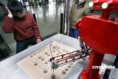 十二月二十九日,一位象棋高手在郑州科技馆同机器人对弈。这个中国象棋机器人是由郑州机械研究所研制,对弈时的聪明程度由人来选择。凡是有兴趣的象棋高手,都可以在郑州科技馆同机器人一决高下。中新社发 慎重 摄