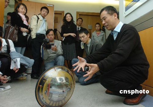 图为徐扬生教授〔右一〕向传媒介绍其新研发的单轮机械人。