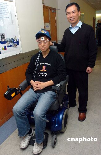 图为徐扬生教授〔右一〕向传媒介绍其新研发的以头部或眼球动作操控的智能轮椅。
