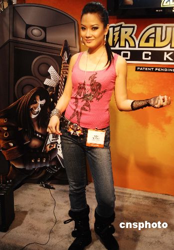 一月九日,一位亚裔乐手在美国拉斯维加斯举办的世界最大消费电子产品展上,表现数字隐形电吉它的奇妙之处,她只需模拟常规动作就会奏出动听的电子乐。中新社发 贾国荣 摄