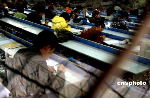 1月19日,北京中国人民大学,硕士研究生考生在应试。当天,2008年全国研究生招生考试开始举行,教育部公布的数字显示,全国硕士研究生报名人数为120万,比去年的128.2万减少8.2万,这是2001年以来报考人数首次下降。中新社发 杨慧峰 摄