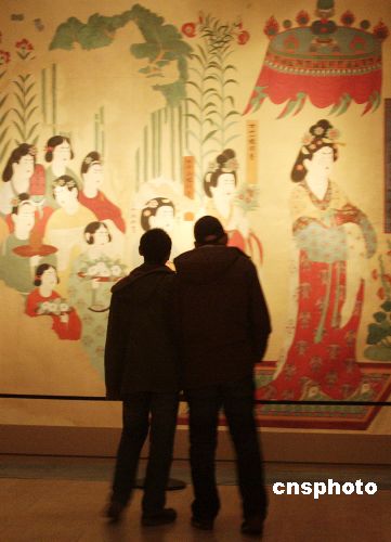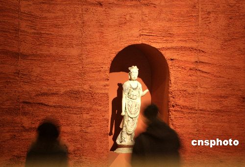 1月19日,“盛世和光——敦煌艺术大展”在中国美术馆展出。该展由中国美术馆和敦煌研究院联合主办,敦煌研究院为此次展览提供敦煌石窟复制洞窟10个、敦煌石窟彩塑复制品11尊、敦煌石窟壁画临本120幅、敦煌莫高窟千相塔出土彩塑真品10件等珍贵展品。据悉,中国美术馆首次对该馆外观进行了大规模的艺术化设计包装。 中新社发 吴芒子 摄