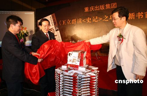 1月24日,重庆出版集团在北京举行《王立群读<史记>之项羽》首发会。该书作者、河南大学文学院教授、中央电视台《百家讲坛》节目著名主讲人王立群(中),与重庆出版集团副总编辑陶勇(左)等出席首发仪式。中新社发 盛佳鹏 摄