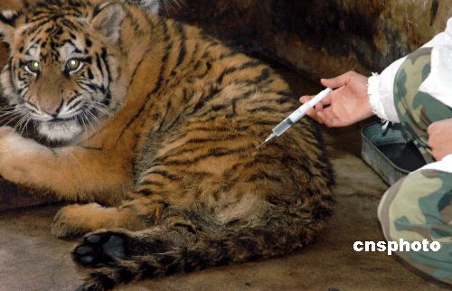 1月29日,一种由国内自主研发的猫细小病毒疫苗首次在东北虎活体上进行试验。在黑龙江省猫科动物饲养繁育中心,两只6个月大的东北虎接受了猫细小病毒疫苗试验。据悉,这种疫苗是针对老虎消化系统疾病进行研发的,要经过多次检测,观察不良反应,然后进行推广。中新社发 张克非 摄