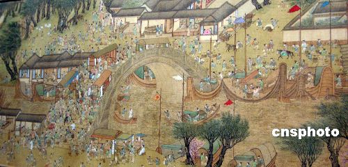 2月1日,“世貌风情——中国古代人物画精品展”在上海博物馆开展。明代著名画家仇英传世名作《清明上河图卷》仿本在展览会上露面。该画结构大体按北宋张择端《清明上河图》的景物顺序布局,描绘的是明朝中期苏州繁荣的景象。图为该画局部。中新社发 姜煜 摄