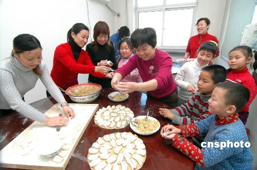 2月3日,为使小学生们寒假更有意义,新春佳节来临之际,辽宁省锦州市太和区小街社区和女儿河小学一起开展“少年饺子”传承民俗文化活动,向小学生们传承包饺子意义及技艺,开展饺子大赛。图为社区阿姨向孩子们传授包饺子技艺。中新社发 李铁成jz 摄