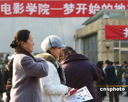 2月中旬,北京电影学院文学系、摄影系、美术系、摄影学院、表演学院等五个院系同时开始报名,报名总人数达到了5100多人。由于部分考生受到南方雪灾影响,在北影专门制订的应急预案中,在专业考试前来自灾区的考生都可以补办报名手续。因江苏省的省级统考受到雪灾影响,到2月17日才能结束。学校表示,将尽量为江苏省考生调整初试中面试考试的时间,但是涉及笔试的考试时间则不能调整。中新社发 杨乘 摄