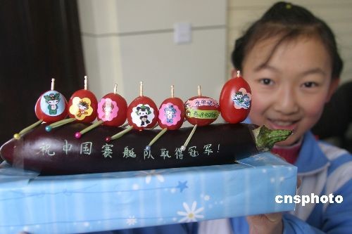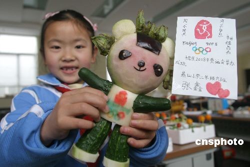 图:小学生展示自制"蔬菜、水果版"奥运主题模型