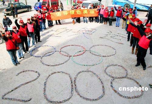 3月3日,山东潍坊市街头,义工们用4000多块废旧电池拼出奥运五环标志,向人们宣传环保知识。当日,由潍坊—鸢都义工组织发起的“倡导绿色奥运”环保活动正式开展,40多名鸢都义工走上街头向人们宣传环保理念,回收废旧电池,进行奥运文化及绿色环保宣传。中新社发 张驰 摄