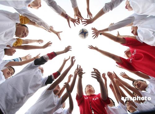 3月27日,重庆清华中学的学生正在与英国爱德华七世国王学校的师生共同开展手球、板球、跳键等体育活动。当日,由英国驻重庆总领事馆牵头进行的团队与梦想”教育交流项目启动,该项目是一个成功的全区项目,它通过一系列的培训和引导,让学生自主举办语言学习及文化交流和文体活动,发展和培养14--18岁在校学生的领导才能。 中新社发 贺终荣 摄