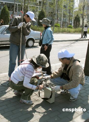 4月3日,北京林业大学气象专业研究生在西城区甘家口街旁利用仪器,实习监测地面高度四至五米高度的空气质量。据操控仪器的学生介绍,测量是为了采集毕业论文数据,当日所检测到的数据值均为良好。据北京市环境保护监测中心日前发布的消息,3月份北京市收获了19个蓝天,使一季度空气质量达标天累计达67天,占73.6%,比去年增加了12天,为九年来历史同期最好水平,空气质量的改善,林木覆盖率的增加,见证了北京对绿色奥运的承诺。 中新社发 邹宪 摄
