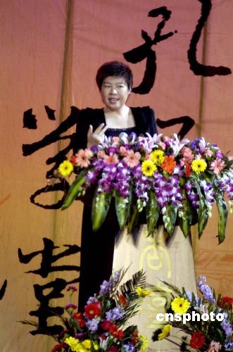 2008年4月5日晚,著名学者、北京师范大学教授于丹来到山东曲阜,作为刚刚开设的“孔子学堂”首位主讲人登上杏坛的讲台。“孔子学堂”是曲阜市与中华书局面向广大普通游客和公众开设的文化大型讲座。今后每年的4月到10月,每月都将邀请一名专家主讲,一名专家现场点评,通过和听众的问答互动,旨在弘扬儒学经典文化。中新社发 张侃 摄