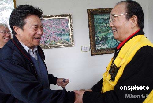 4月15日,以北京植物园景观为专题的“王石之油画展”在植物园盆景园内开幕,是次画展是由曾画毛泽东巨像的中国著名画家王石之创作完成,展出的40幅油画都是以一画一景的形式从植物园的春天到冬天不同季节,不同区域的自然风光、园林美景、人文古迹等优美景观。图为李光曦(左)与高占祥出席开幕式。中新社发 钱兴强 摄